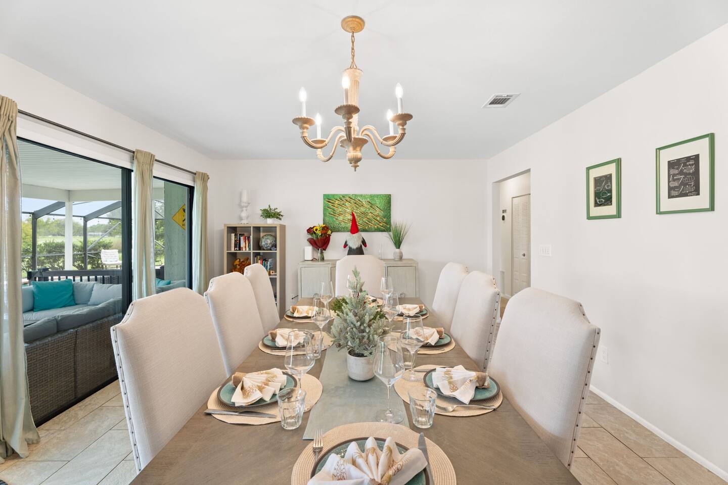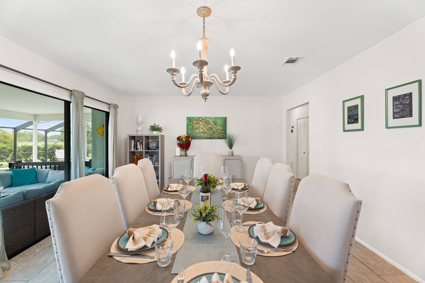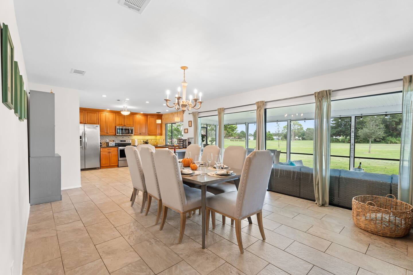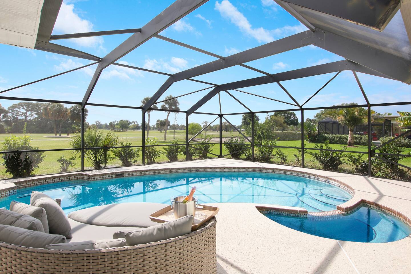 Welcome to your Golfer’s Dream Retreat, a bright and spacious home that blends resort-style comfort with homelike ease. Overlooking The Saints Golf Course, every window frames peaceful green views and Florida sunshine. Inside, four beautifully appointed bedrooms and two modern bathrooms offer plenty of space for families, golf groups, or friends traveling together. The fully stocked kitchen, large dining area, and open-concept living room with a smart TV make gathering effortless. Step outside to your screened-in patio and private pool oasis—perfect for morning coffee, lazy afternoons, or sunset dinners fresh off the grill. The pool and spa can be heated for year-round enjoyment. With family-friendly touches, beach gear, and thoughtful amenities throughout, this home is designed to make every stay seamless, relaxing, and unforgettable. Whether you’re here for golf, sunshine, or simply slowing down—you’ll find everything you need right here.